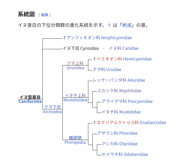 環境適応能力が高かった「イヌ型亜目」から、系統図の通り「イヌ下目(イヌ科)」(狼、狐、犬など)と「クマ下目」に、「クマ下目」の中で「クマ科」「鰭脚類(ききゃくるい)「イタチ上科」に進化していきます。